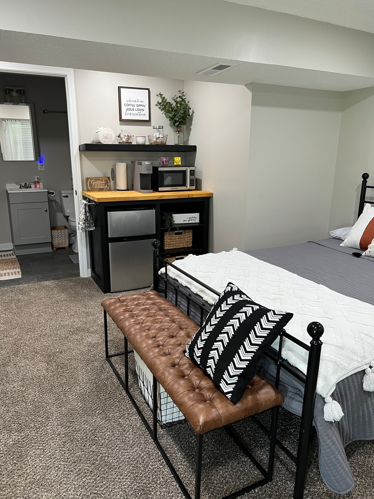 Come enjoy your stay at our home with a private entrance and outdoor patio in the back of the house in a quiet and peaceful neighborhood. You will have an entire guest suite to yourself including one bedroom with an attached bathroom as well as a pull out couch for additional sleeping arrangements. Prepare meals and cocktails at the wet bar before settling down in front of the fireplace and watching your favorite movie on the smart TV w/ access to free wifi.