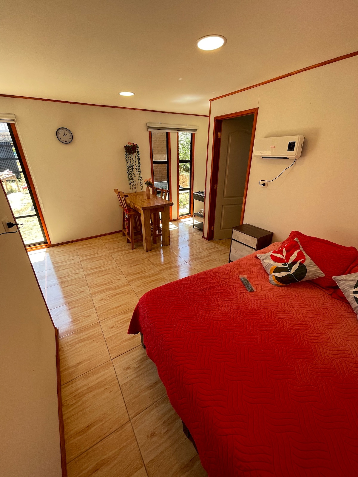 Lugar único, espacio privado muy tranquilo con lo preciso para descansar, posee una amplia ventana con vista directa a la carretera acceso norte de la ciudad y al bello hospital. departamento completo privado en un 2do piso, con entrada independiente, cocina para preparar lo básico con lavaplatos, microondas, frigobar y loza. Baño shower door con agua caliente calefont. Dormitorio con cama de 2 plazas, 2 velador. todo impecable y bello para tu agrado.Sólo personas tranquilas descanso o trabajo🔆