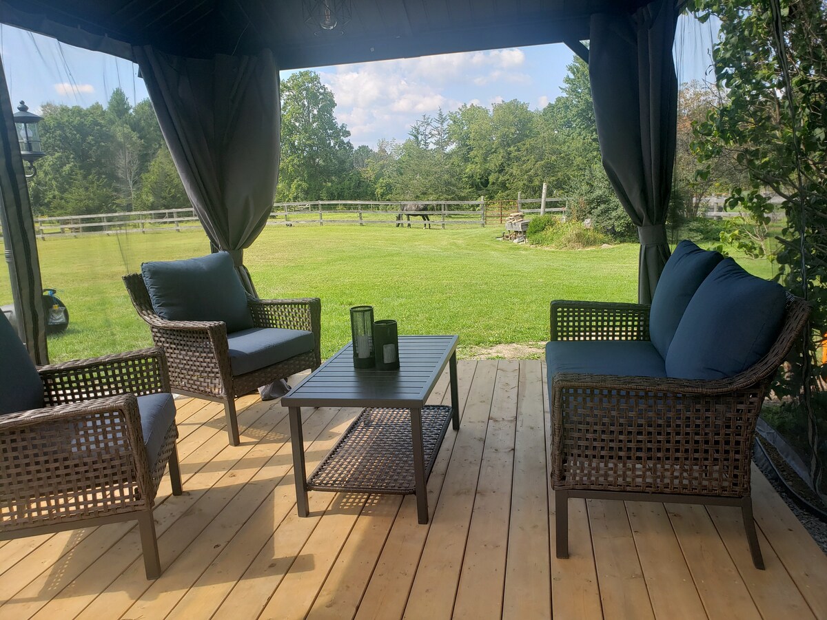 „Glamping“ vom Feinsten. Erlebe eine ganzjährig geöffnete Hütte abseits des Alltags, versteckt in einer sehr privaten Lage auf den Barking Goat Farms, zwischen Toronto und Ottawa. Genieße deinen Morgenkaffee auf der schönen, abgeschirmten Veranda und verbringe deine Abende am Lagerfeuer, während du inmitten der ruhigen Umgebung die Sterne betrachtest. Viele lokale Sehenswürdigkeiten zu besuchen oder einfach abzuschalten und zu entspannen. Perfekt für einen romantischen Kurzurlaub zu zweit oder einen unterhaltsamen Mädchenausflug. Genieße ein kostenloses Treffen und Begrüßung mit unseren Ziegen und Eseln