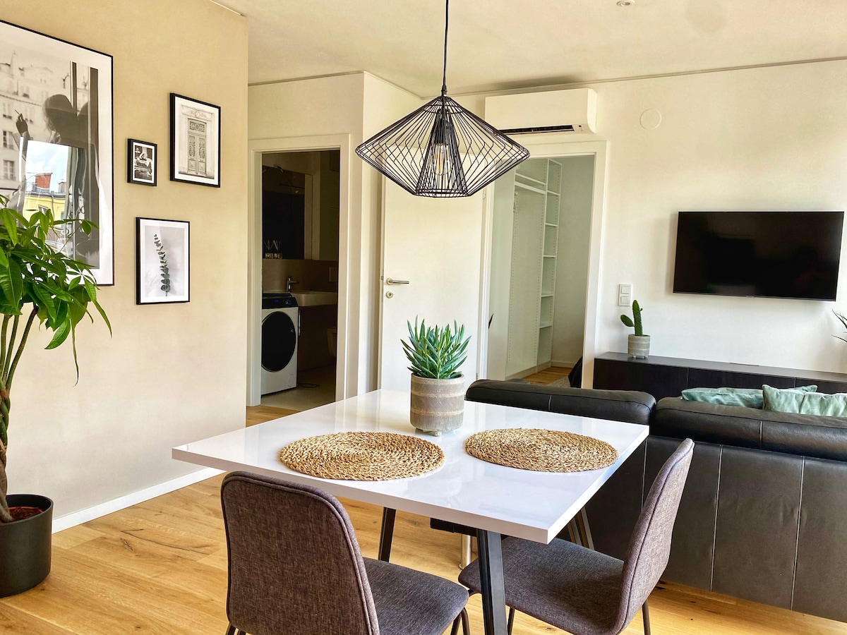 Meine perfekt gelegene (nur 10 Gehminuten vom 1. Bezirk entfernt) 72 m2 (= 720 sq ft) große moderne Wohnung ist sehr sonnig mit riesigen Terrassentüren und schön eingerichtet. Alles ist mit den öffentlichen Verkehrsmitteln bestens erreichbar; die U1 (U-Bahn) ist nur 2 Minuten entfernt. Du hast vollen Zugang zur gesamten Wohnung, inkl. Geschirrspüler, Waschmaschine, WLAN und Kochutensilien. Eingangshalle, offene Küche (NESPRESSO-Maschine), Ess-/Wohnzimmer, Schlafzimmer, Badezimmer, separates WC + kostenlose Parkplätze