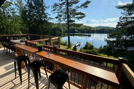 CITQ # 299883 Elegantes Landleben Die Laurentides 45 Minuten von Montreal entfernt. Hundertjähriges Chalet mit allen modernen Annehmlichkeiten (unbegrenztes Highspeed-WLAN (Fibe 1000), Nespresso (Vertuo), Klimaanlage, Holzofen usw.). Panoramablick auf den Guindon-See und Zugang in einer Minute zu Fuß (Tretboot und Kajak inklusive). Die Ruhe am See erwartet Sie 5 Minuten von St-Sauveur, Skipisten und Wasserrutschen entfernt.