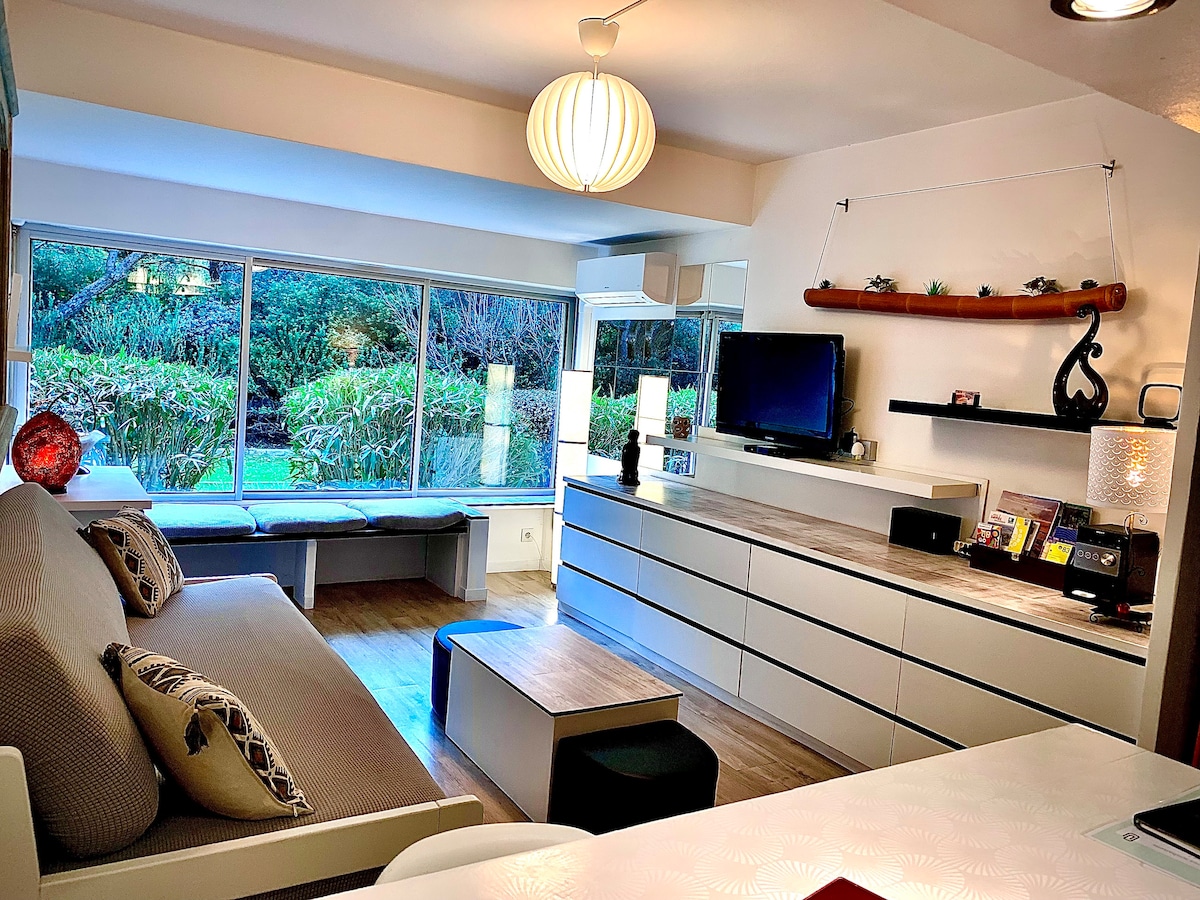 Aux Sablettes ,grand studio climatisé avec une partie nuit en bord de mer, dans un cadre verdoyant et au calme sans passage dans une résidence sécurisée. Sa situation géographique est située dans l'un des plus beaux parcs du Var et une grande plage de sable fin à 2 min, ses restaurants, commerces, marchés et animations l'été. Idéalement situé afin de découvrir les richesses de notre belle région, balades, et sports nautiques. Draps et serviettes de toilettes sont à votre disposition.