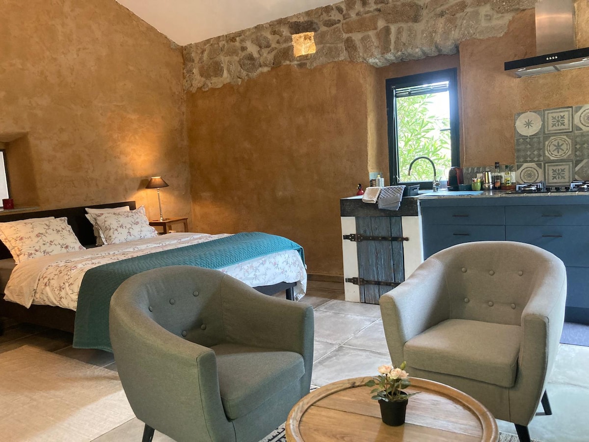 Die Unterkunft ist ein Teil des Mas mit einem separaten Eingang und einem eigenen kleinen Pool (nicht geteilt) und zwei Terrassen. Sie ist ca. 45m2 groß, besteht aus einem großen Schlafzimmer mit TV, Stauraum, Küchenzeile und einem großen Badezimmer und einer begehbaren Dusche. Der gesamte Raum ist offen, es gibt keine Trennung zwischen Schlafzimmer und Küchenzeile. Die Terrasse ist nach Osten ausgerichtet, sehr angenehm im Sommer. Sie überblickt den achteckigen Pool von 3,50 m.