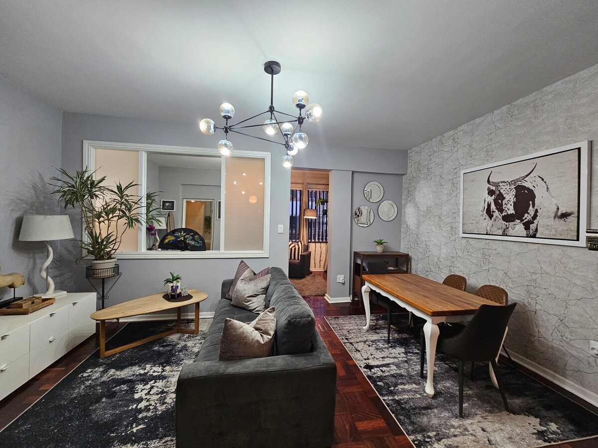 Tauche ein in das moderne und stilvolle Ambiente dieser eigenständigen Wohnung mit 2 Schlafzimmern. Zentral im Herzen von Sandton Central gelegen, ist es nur wenige Gehminuten von allem entfernt, was Sandton zu bieten hat. Das Gebäude verfügt über einen schönen Pool für ein kurzes Bad und es gibt Fitnessstudios in der Nähe, um die Schokolade abzuarbeiten. Die Betten sind bequem, die Wohnung geräumig und die Badewanne super! Komm und schaue Netflix und entspanne dich mit schnellem WLAN oder erkunde das fantastische Nachtleben, das das schöne Sandton zu bieten hat. Wir freuen uns auf deinen Aufenthalt!