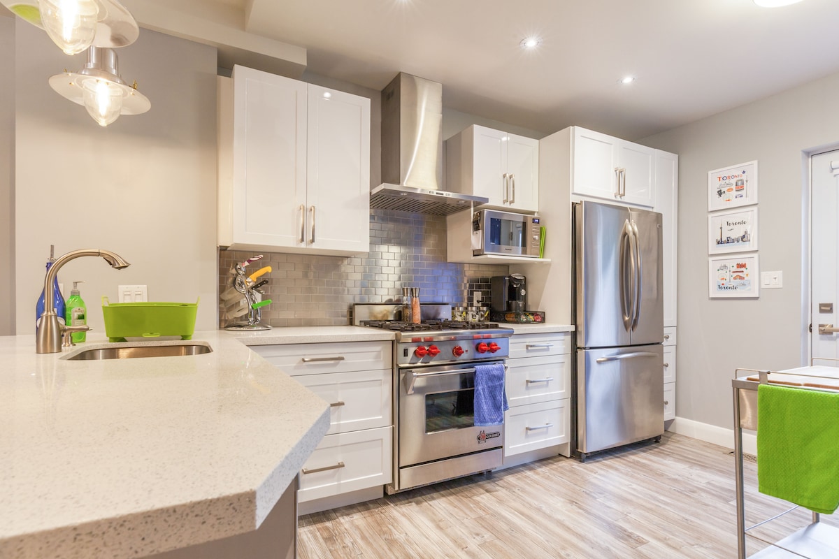 Frisch renovierte, geräumige Keller-Suite mit einem Schlafzimmer. (Couch lässt sich nicht ausziehen) Das Hotel liegt in einer ruhigen Straße mit eigenem Eingang. Queen Street East, Woodbine Beach, The Beaches Nachbarschaft & 2 - 24 Stunden Straßenbahnen in die Innenstadt. 8'-2" hohe Decken, Fußbodenheizung, voll ausgestattete Küche, WLAN, NETFLIX Schlüsselcode für einen einfachen Zugang. Wir wohnen in den oberen Etagen und teilen dir gerne alle Einblicke in die Stadt mit, wenn gewünscht! Shampoo/Spülung, Duschgel, Handtücher Parken auf der Straße – 20 $/24 Stunden, 28 $/48 Stunden, 42 $/Woche