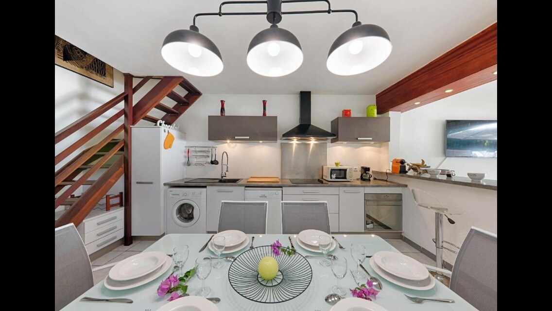 Villa moderne tout équipé avec jacuzzi/mini-piscine de 2,70mx2,70m , 2 chambres avec lit King-size 160x200 dont une sur-mesure équipé de climatisation, armoire de rangement et télévision. Salle de bain confort avec douche à l'italienne, WC moderne. Salon équipé de fauteuil, télévision et table de repas. situé dans un endroit calme, à 10 minute de saint pierre et de la plage avec jacuzzi privatif uniquement pour votre logement, parking.