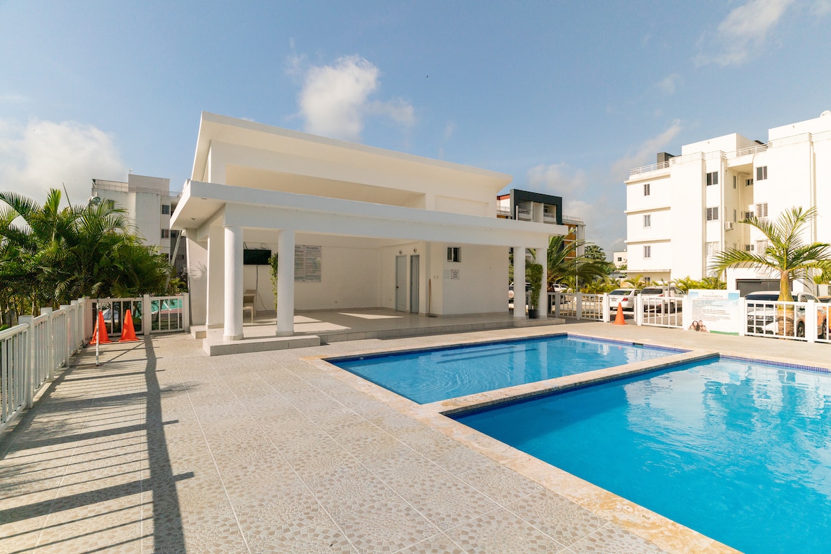 Diese neue Wohnung ist die perfekte Unterkunft für einen Urlaub mit der Familie und Freunden. Sie befindet sich 10 Minuten vom Flughafen Santiago entfernt, ist mit vielen Annehmlichkeiten ausgestattet und komplett möbliert. Es gibt 3,5 Badezimmer, 3 Schlafzimmer mit Klimaanlage und ein Gästezimmer mit einem Doppelbett, Ventilator und eigenem Badezimmer. Voll ausgestattete Küche, zwei Wohnzimmer, Klimaanlage, zwei 50-Zoll-Smart-TV, Bluetooth-Lautsprecher und zwei Parkplätze. Du kannst auch die Umgebung des Komplexes wie den Spielplatz, den Pool, den Veranstaltungsraum, den See und den Sportplatz genießen.