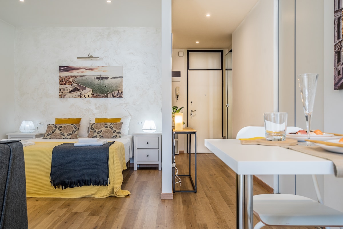 Accogliente appartamento con vista superlativa di 45 mq al terzo piano, situato nel cuore di Venezia, zona centralissima, strategica servita in maniera ottimale. L'appartamento è un loft con travatura a vista, composto da ingresso, angolo cottura, bagno, zona giorno verandata con divano letto matrimoniale, zona soppalcata con letto matrimoniale. L'appartamento è dotato di tutto il necessario: riscaldamento autonomo, frigo, TV, microonde, lavatrice, phon, aria condizionata, WiFi, lettino per bebè