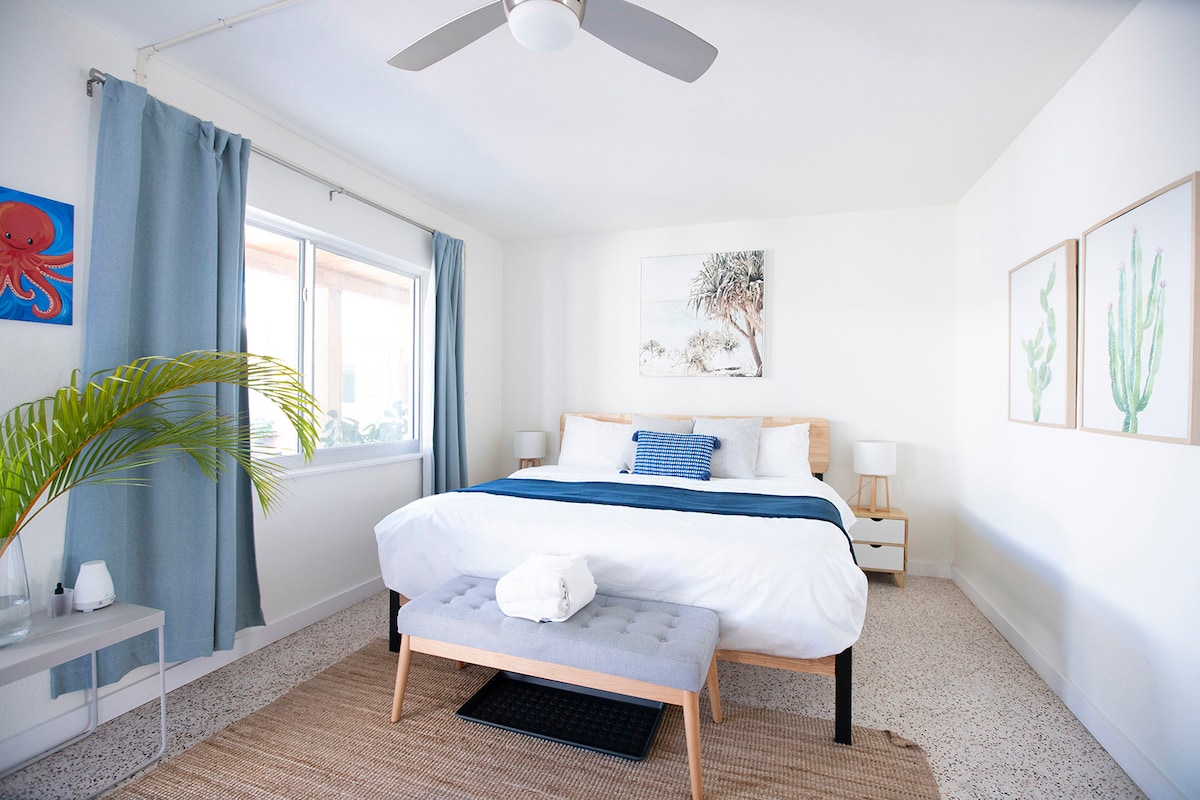 Es mag klein sein, aber es gibt mehr als genug Platz für dich, um dich in diesem Studio zu entspannen. Platz für 2 Personen. *Die Einheiten nebeneinander haben eine angrenzende Tür. • Kingsize-Bett • Flachbild-Smart-TV • Minikühlschrank • Mikrowelle • Kaffeemaschine • WLAN • Strandbedarf (Wagen, Stühle, Sonnenschirm) • Außendusche