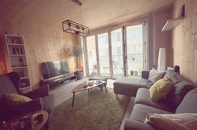 Mit seiner Holzrahmenstruktur ist meine Wohnung der ideale Ort, um Lüttich in aller Leichtigkeit und Ruhe zu genießen. Vollständig passiv und auf Energieeinsparung ausgelegt, ist sie mit einigen Extras ausgestattet, um Ihren Aufenthalt noch angenehmer zu gestalten, wie z. B. einem beheizten Spiegel oder einem Kino im größten der Zimmer. Sie bietet Platz für bis zu 4 Reisende und ist meine erste Immobilie, die ich nach meinem Geschmack gestaltet habe: einfach, originell, mit einem Hauch von Humor hier und da.