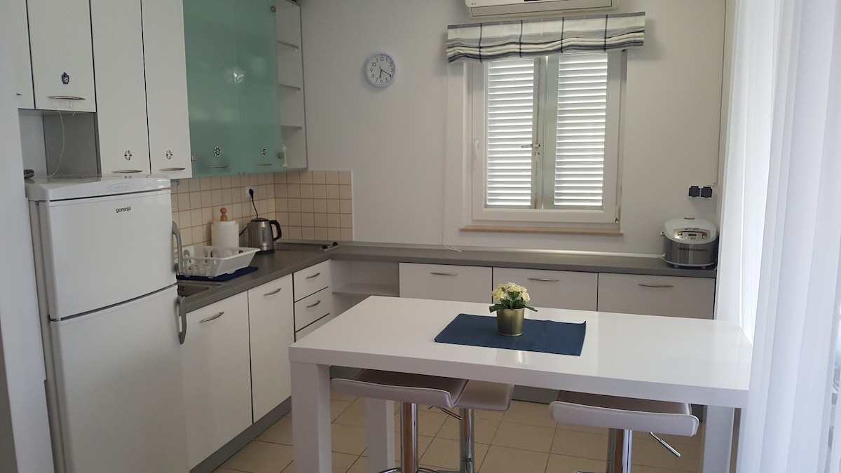 Schöne neue komplett renovierte Wohnung (Jahr 2022) mit herrlichem Blick auf das Meer. Das Haus befindet sich außerhalb der Stadt in einer ruhigen Gegend, zwischen Kiefern und Pflanzen. Genieße deine Mahlzeiten auf der Terrasse, die mit einem traditionellen Steingrill zubereitet werden, mit einem natürlichen Kiefernschatten. Der öffentliche Steinstrand befindet sich direkt vor dem Haus, sodass du zu jeder Tages- und Nachtzeit sauberes Meer genießen kannst. Erlebe gelegentlich den berühmten Wind Bura, der nachweislich Vorteile für die Atemwege hat.