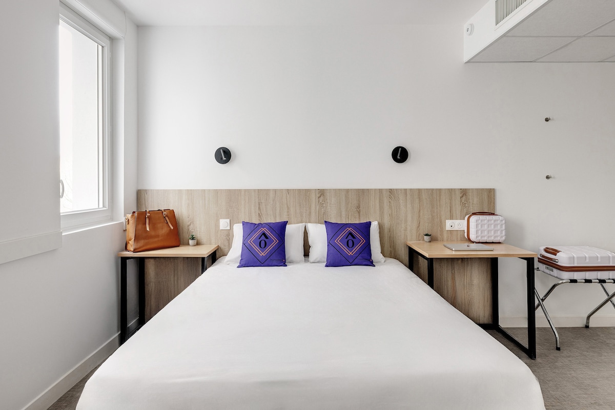 It's all there! Comfort and practicality in 10m² of unique, warm mezzanine design. Whether you're a solo traveler or a couple, you can unwind after a hard day's work or a city tour, in a bed as soft as whipped cream. 49-inch TV and Chromecast available in the room, with full wifi. Rrainfall shower and eco-friendly products, library of curiosities.
