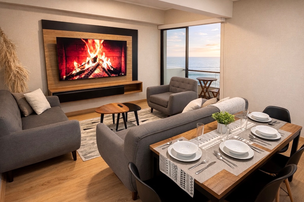 *Recently refreshed apartment, lobby, and elevators Enjoy a privileged oceanfront view above the luscious green coastal parks of Miraflores, perhaps the best in Lima! Listen to the waves crashing on the rocks below while relaxing or napping and stroll up the boardwalk for some of the best food in the world! Just a short 2 block walk down the malecon to the picture-perfect lighthouse, 5 blocks to Avenida la Mar and ~10 to Larco Mar. Enjoy the building's *shared* roof-top pool and grill!
