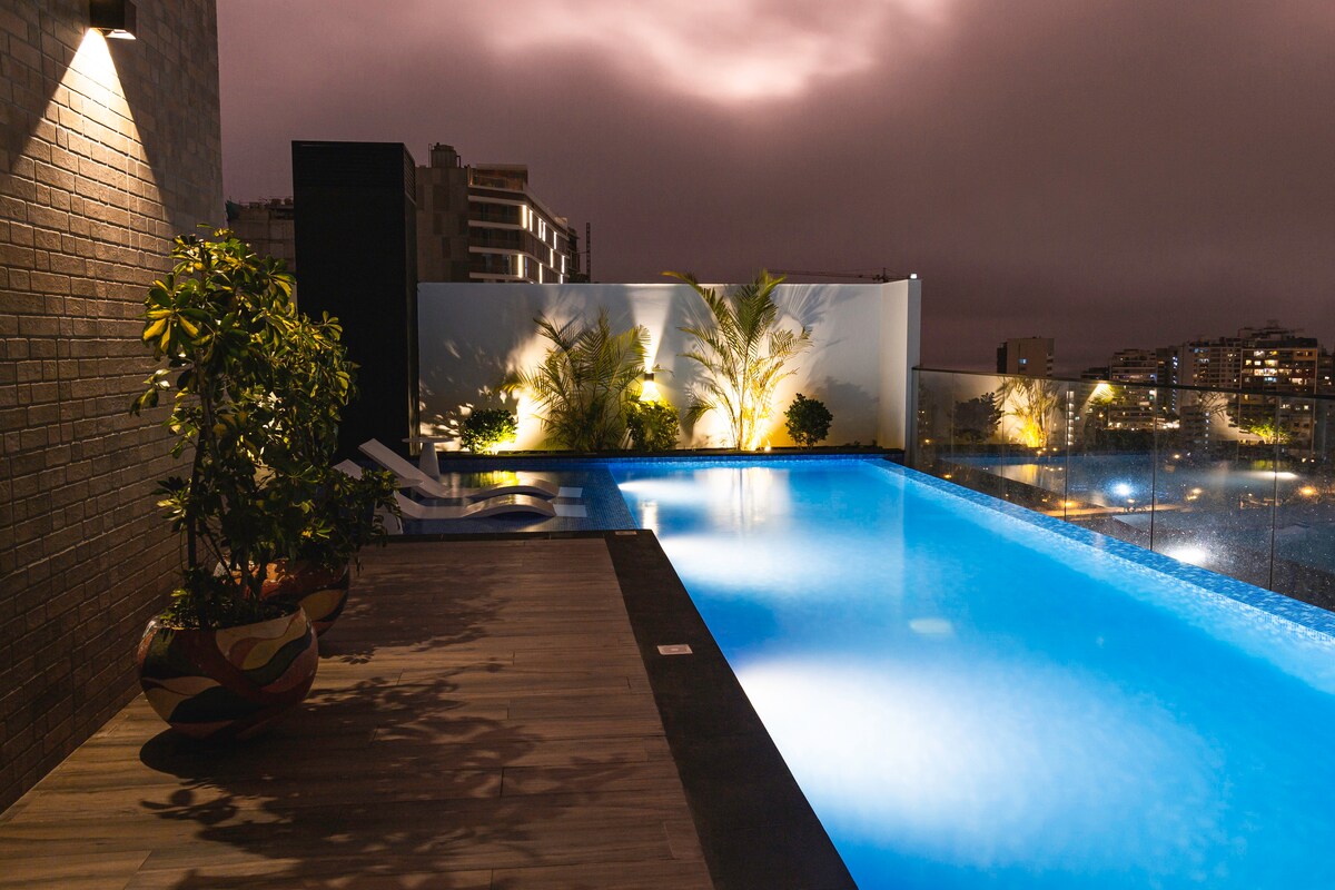 Genießen Sie Barranco, nur wenige Schritte von Miraflores und der Promenade von Larcomar entfernt. Diese moderne Wohnung bietet einen spektakulären Blick auf das Meer und Zugang zum Pool und Whirlpool mit 360°-Blick auf die Stadt und das Meer. Ideal für Paare, Familien oder Remote-Arbeit mit Highspeed-WLAN. Sicherheit rund um die Uhr, Self-Check-in und tierfreundlich. Ich helfe dir gerne bei der Entdeckung von Aktivitäten wie Surfen oder Paragliding in Miraflores. Erleben Sie Komfort, Privatsphäre und eine privilegierte Lage.