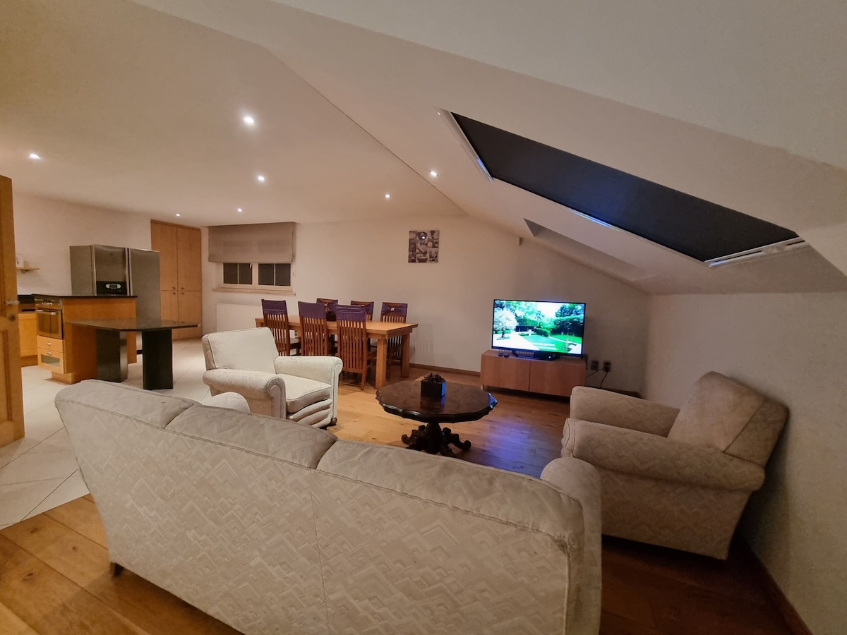 Modern eingerichtete Wohnung neben dem Haupthaus mit separatem Eingang. Mitten im Grünen gelegen, mit schönen Wanderwegen und Mountainbike-Netz in der Nähe. 1 Schlafzimmer mit Queensize-Bett, 2 Zimmer mit Kingsize-Betten. Ein Reisebett für Kinder ist vorhanden. Im Wohnzimmer gibt es ein großes Ecksofa und einen Essbereich für 10 Personen. Im Garten haben Sie einen Blick auf die Pferde... Separate Terrasse mit Lounge-Set Verleih von 2 Elektrofahrrädern vor Ort. Reiten / Frühstück / Grillen auf Anfrage möglich.