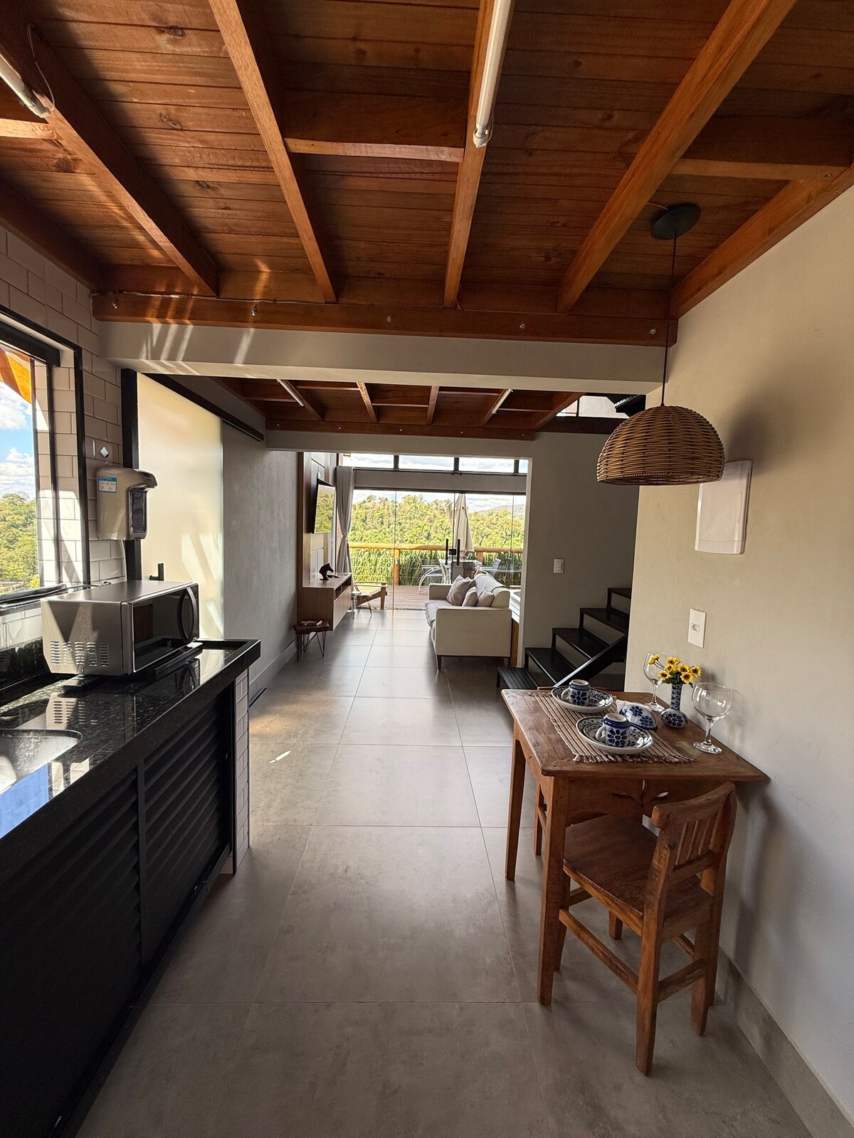 Refúgio romântico em meio à natureza, ideal para casais. Chalé estilo suíço (A-frame) em sítio cercado por cafezais, com rio e cachoeira particulares. Possui banheiras externas com vista para a Serra da Mantiqueira, jacuzzi interna, fogueira, churrasqueira, quadra de beach tênis, cama-balanço, sauna seca com vista e projetor interno com telão de 100”.