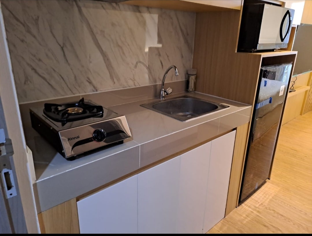 Stay comfort in a warm studio room with nice city view and the lagoon beside. Completed with kitchen set, queen bed size and working space with unlimited wifi access, your stay will feel like home. Enjoy various facilities: swimming pool, kids play area, gym, shopping mall, cinema and various restaurants. For health and safety reason to all of the guest, this apartement is cleaned with antiseptic and desinfectant before check-in.