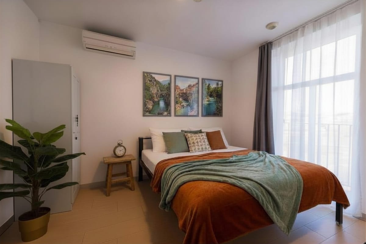 Enjoy your own private space in the heart of Kranj! Our cosy double room is perfect for couples or friends seeking privacy. The room features a window facing the scenic Kokra River Canyon, offering a glimpse of nature and plenty of natural light. Located in a renovated historic building on the ground floor, you'll have easy access to all amenities. Guests share a fully equipped kitchen, a lounge, and modern bathrooms. Fast Wi-Fi and a central location near the library included!