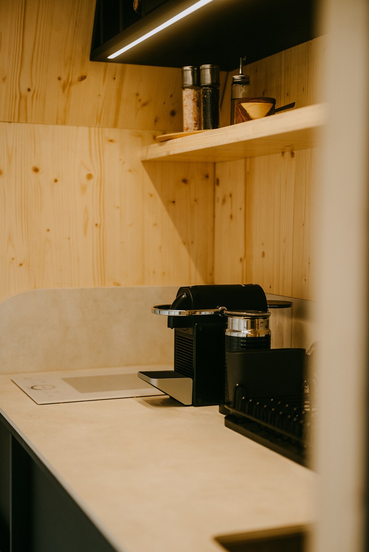Miejsce stworzone do obserwacji natury i komfortowego wypoczynku. Wyobraź sobie wygodny, dwupoziomowy apartament z przestronną strefą dzienną, z sofą, niewielką kuchnią, łazienką oraz antresolą z dużym japońskim łóżkiem futon. To wszystko połączone z ogromnym panoramicznym oknem przez, które możesz całymi dniami podglądać przyrodę i żerujące na łące dzikie zwierzęta. Nocą Twój apartament zamienia się magicznie w planetarium pod rozgwieżdżonym niebem.