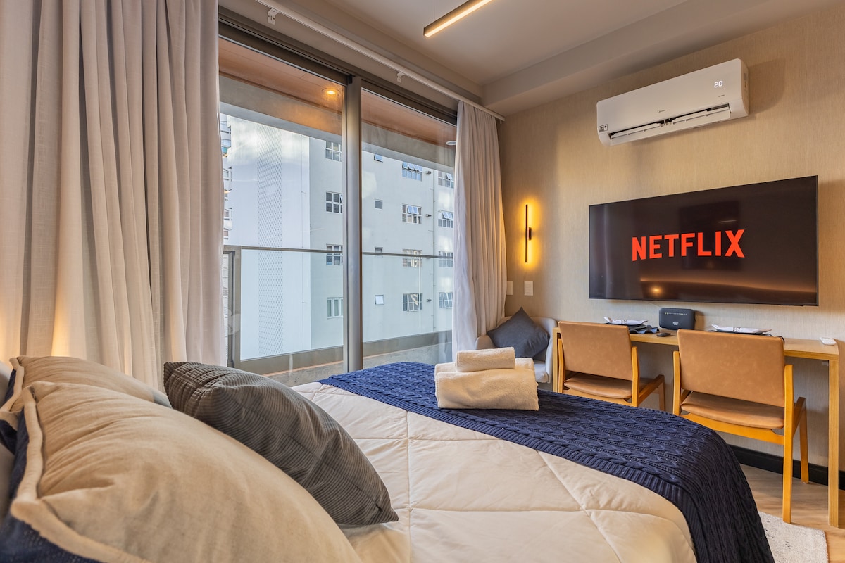 Experience One Eleven in Vila Olimpia. This modern apartment features large windows with breathtaking city views and natural light. The unit boasts 600 Mbps internet and a 4K HD TV. For total comfort, it has a Hot/Cold AC system: 27,000 BTU/h unit in the living room and 10,000 BTU/h in the bedroom. The bedroom is quiet and dark for a restful sleep. Impeccably maintained, you’ll be walking distance to top restaurants and business hubs—a safe, upscale retreat with a stunning urban backdrop.