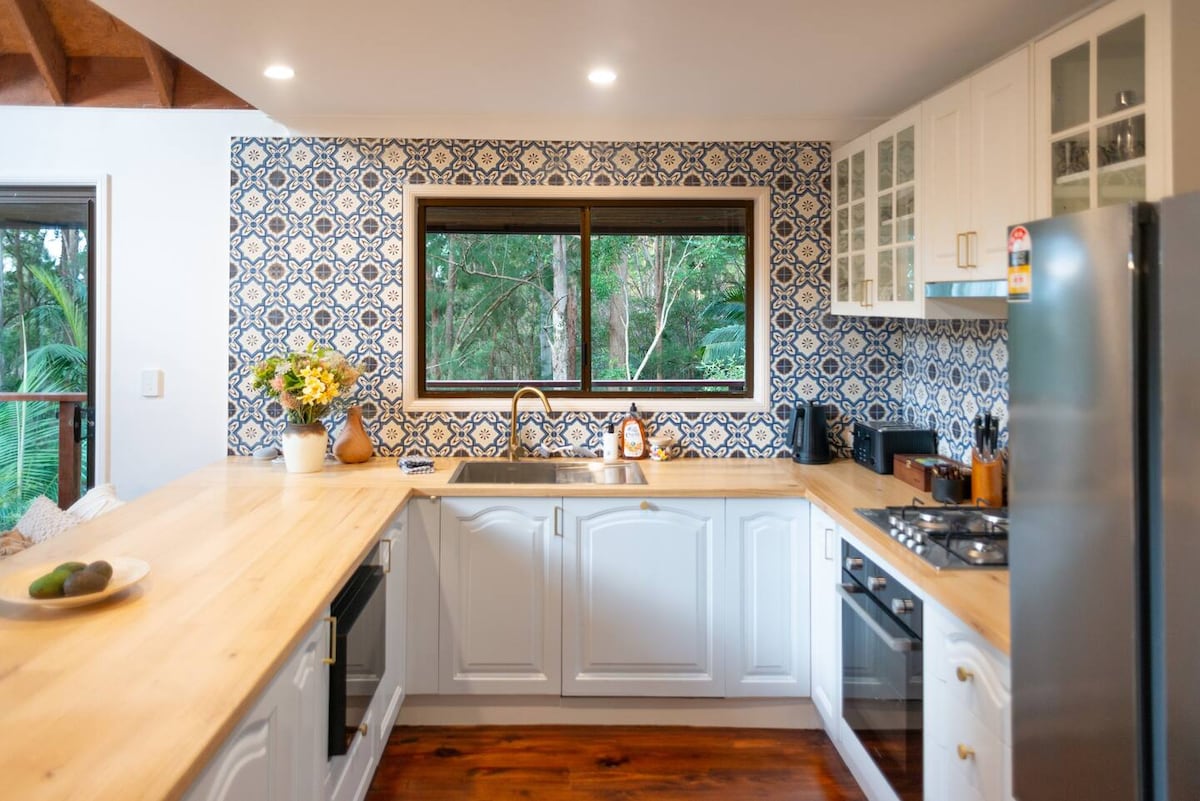 The unique cottage sits in a quiet street in North Tamborine surrounded by national parks. The property boasts hand made windows, hand carved etchings and joinery and stonework that will leave you in awe and exploring for days. It's a short drive to the rainforest walks, brewery, wineries, artisan cheese factory, the famous Gallery Walk, wedding venues and many other local restaurants and attractions of Tamborine.