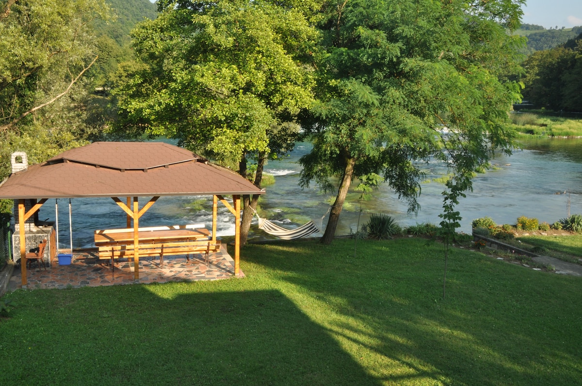 Mein Haus befindet sich in der ruhige Lage vom Fluss Una. Der Platz ist von der Stadt 15 km entfernt. Die Fahrt bis Stadtzentrum dauert 15 Minuten. Es ist wunderbar für die Paare, die Familien und kleine Gruppen. Das Haus ist mit alles, was mann auch für den längeren Aufenthalt braucht, ausgestatted. Das Erdgeschoss enthielt die Eingangshalle, das Bad, die Küche, das Wohnzimmer und die Terrasse. In dem Dachgeschoss befindt sich das Schlafzimmer für drei Personen. Herzliche Willkommen !