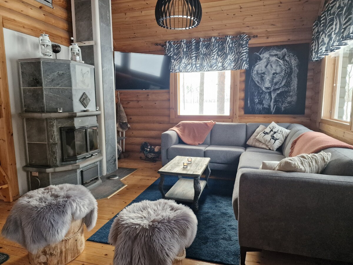 Eine moderne und stimmungsvolle Wildnisstube aus handgeschnitzten Baumstämmen, die 2022 gebaut wurde. Die Hütte wird mit einem💫🔥 360-Grad-Drehkamin beheizt. Vom 🎇 Panoramafenster der Hütte aus können Sie die wechselnden Jahreszeiten und die Nordlichter bewundern. ☺️Ruhige Lage und einzigartige Natur in der Umgebung. 🔥Große separate Sauna unter demselben Dach 🥾In der Nähe des Nationalparks markierte Wanderwege Flughafen ✈️Kittilä 156 km Flughafen ✈️Enontekiö 5 km 🎿Umfangreiches Langlaufloipennetz 8 km 🐶Hetta Huskies 7 km 🏘️Geschäft 8 km 🦌Näkkälä Eräpalvelut 8 km oder 46 km