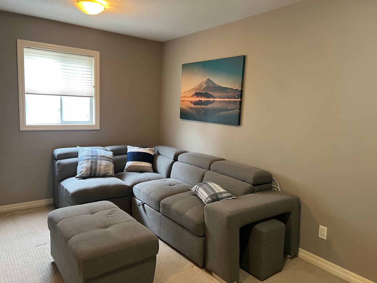 Private lower-level suite with a bright bedroom, den/office with a single bed, and a comfortable living room. Includes a private bathroom, small kitchenette, and access to a shared full kitchen upstairs. This unit features a TV, mini fridge, microwave, air fryer, coffee machine with coffee provided, and a dining table for two to three people. Guests also have access to a private hot tub room. The shared front entrance leads directly downstairs to the suite.