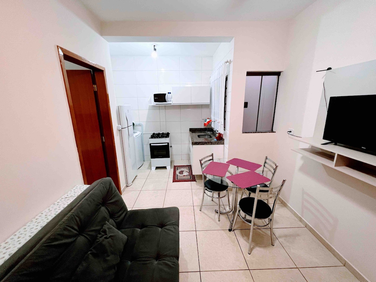 Flat moderno e recém-inaugurado, área verde e tranquila com localização estratégica. 🕒 Self check-in rápido e prático: Todo o processo leva menos de 5 minutos, mais rápido que hotel! Aqui você tem sua própria cozinha equipada, ideal para preparar refeições com praticidade, conforto e liberdade. O espaço oferece: Internet cabeada e Wi-Fi, Cama de casal com roupa de cama, Banheiro, Cozinha com geladeira e cooktop, Cortina blackout, Mesa, Cadeiras, Espelho e Estacionamento. Espaço exclusivo Seu.