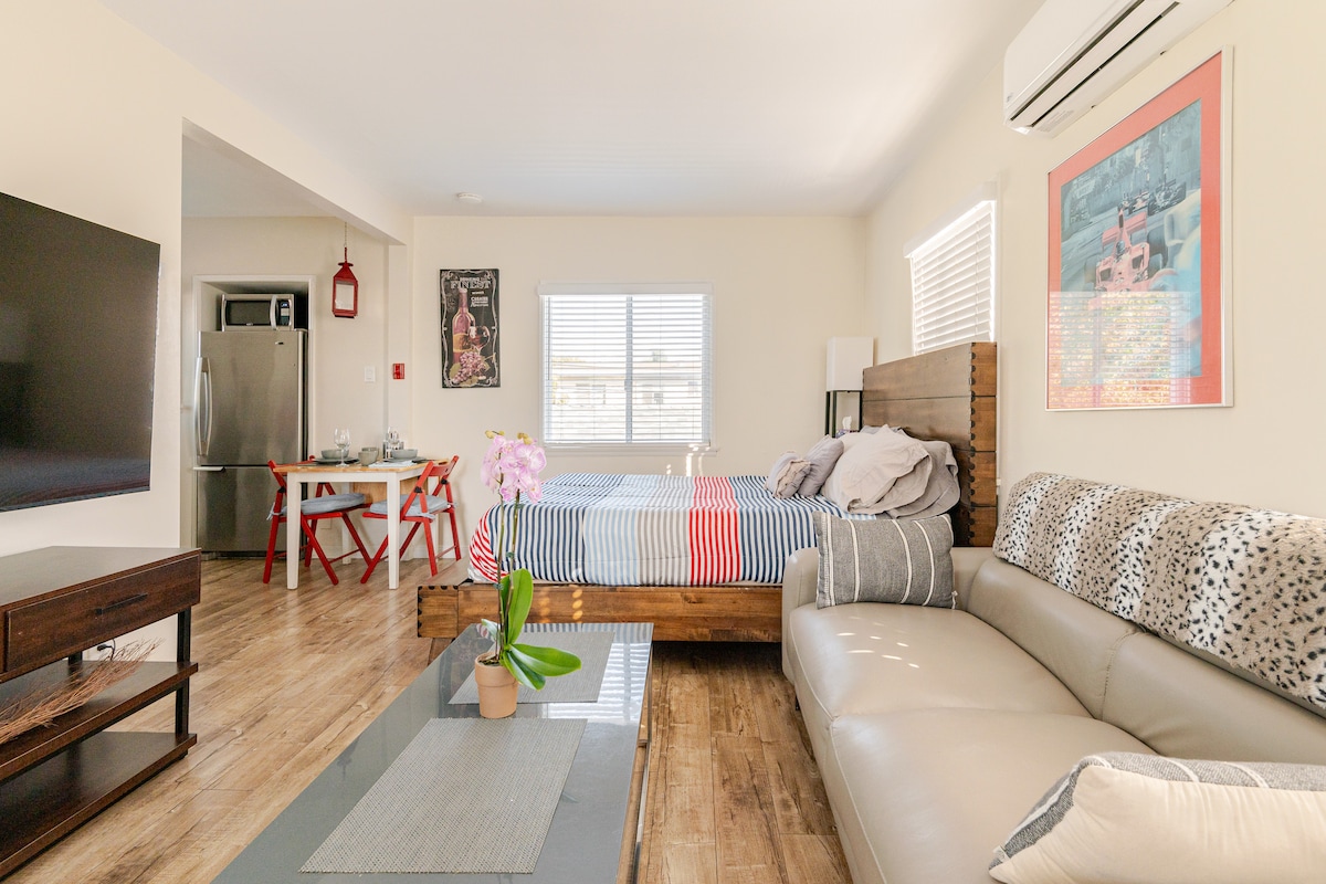 Genieße das elegante Design unseres Studio-Raums im Herzen von LB. Mit einem gemütlichen Queensize-Bett, einer schönen Küchenzeile mit kostenlosem Kaffee und Tee, einem kompletten Badezimmer und Palisander-Möbeln, die ein entspannendes und warmes Erlebnis bieten. Unsere Einheit ist nur wenige Gehminuten von den besten Restaurants, Sehenswürdigkeiten wie dem Küstendorf, dem Aquarium, der historischen Pine Avenue und dem Kongresszentrum entfernt. Sie liegt auch in der Nähe der U-Bahn und des Meeres, ideal für Gäste, die ohne Auto reisen.