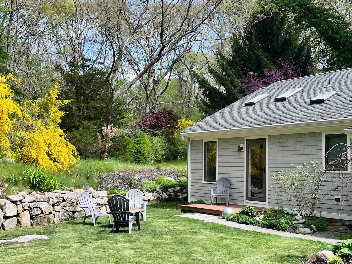 Escape the city, work in nature! Totally private cottage with garden views , central air and heated floors. 1 mile from pristine beaches and center of town, LIRR, Hampton Jitney, 3 large grocery stores, Starbucks, organic market, shopping & restaurants. King bed, cable TV, refrigerator w/ice, microwave, outdoor grill, private yard, Perfect for couples, solo, 1-2 small kids. We welcome small dogs for a $100 fee. Please message us with the size and type. Working couple/owners in main house.
