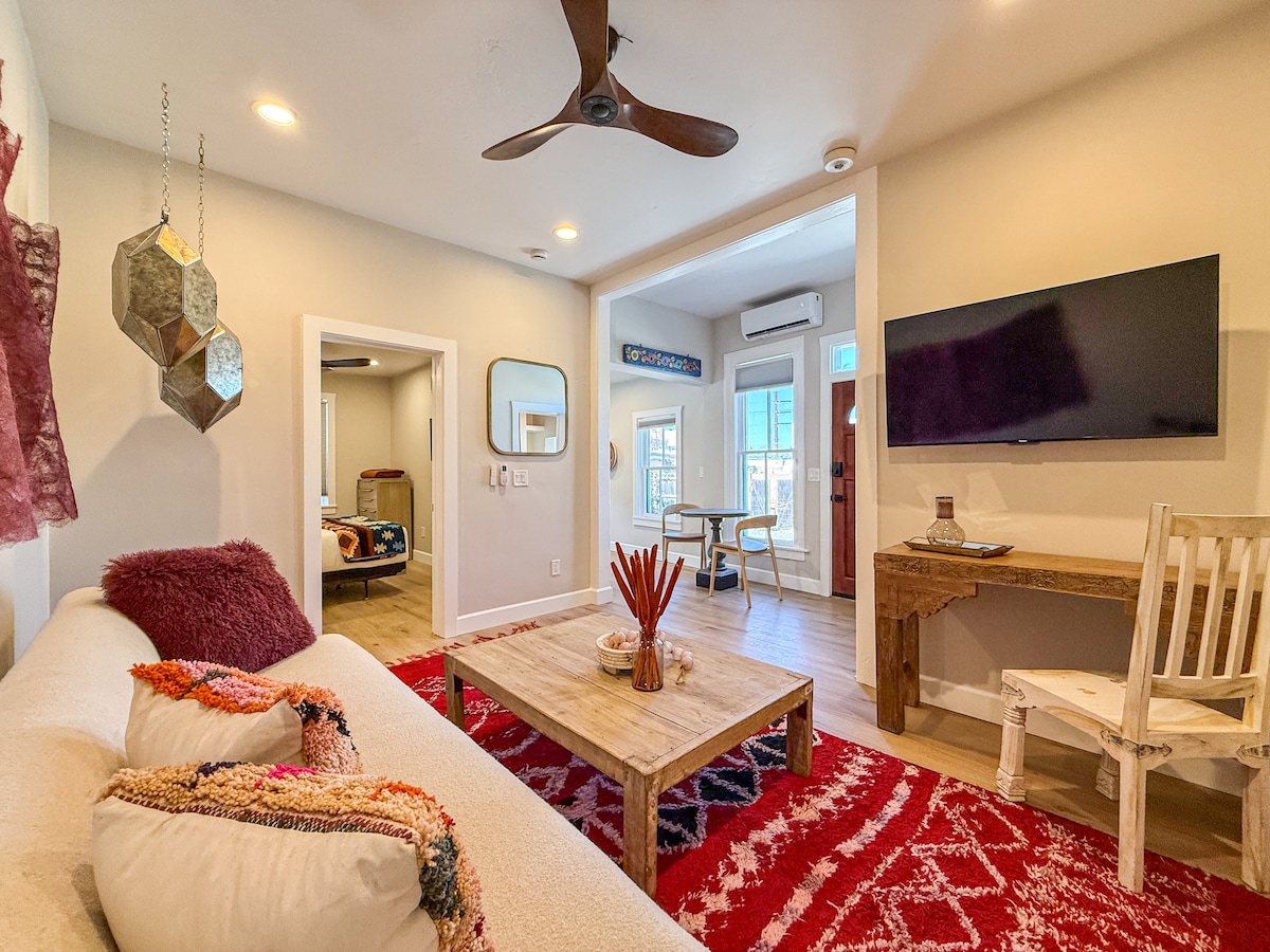 Luxuriöse Designer-Wohnung im Erdgeschoss im Santa Fe's Baca Railyard District. Voll ausgestattete Kochküche mit Essbereich für 4 Personen, Geschirrspüler, Waschküche. private Terrasse, nur wenige Schritte vom Cafécito (Café), zentral von Meow Wolf, Railyard Park und der Plaza entfernt. + Voll ausgestattete Küche + Geschirrspüler + Waschmaschine/Trockner + Komfortables Kingsize-Doppelbett + Klimaanlage & Strahlungsheizung Einfacher Zugang zur Innenstadt über einen malerischen Weg. Highspeed-Internetzugang. Kingsize-Bett mit luxuriöser Bettwäsche. Whole Foods & Trader Joe's in der Nähe. Weitere Einheiten verfügbar.