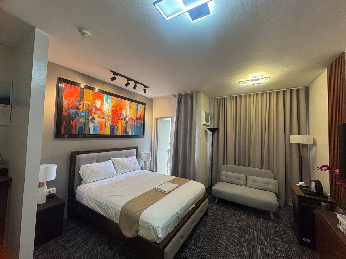 - Kingsize-Bett mit frischer Bettwäsche und Handtüchern -Kostenloser Parkplatz -WLAN. -4K-Fernseher (mit Netflix, Disney, Amazon) - Voll ausgestattete Klimaanlage - Shampoo, Seife und Toilettenpapier. - Zen Zimmerzugang - Zugang zur gemeinsamen Küche -Mikrowelle/Reiskocher/Wasserkocher/Kühlschrank - French Press & Fresh Coffee Grounds - gereinigtes Trinkwasser -Außengrill Entspannen. Neustart. Aufladen. Neu entfachen. Diese Suite ist ein charmantes Refugium für Paare und bietet einen ruhigen Gartenblick, den atemberaubenden Tagaytay-Kamm und eine bezaubernde Skyline der Stadt.