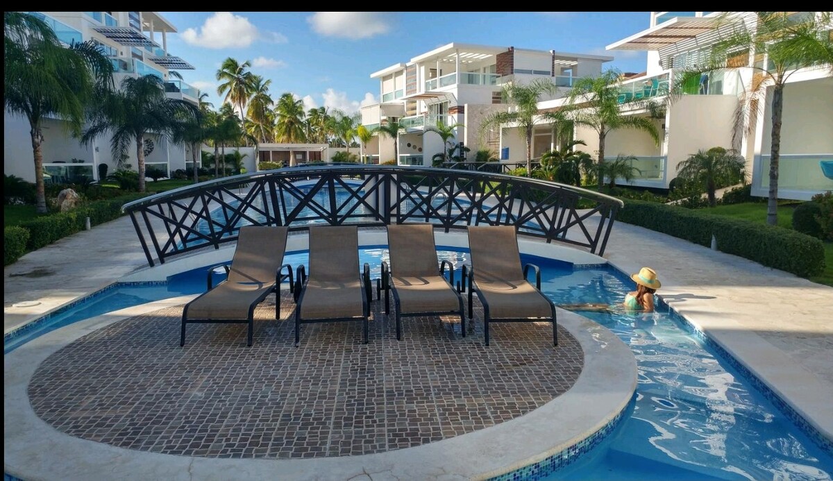 Private Balcony Picuzzi with Epic Pool Views | Full Resort Access | 2 Bed • 2 Bath • Sleeps 4 | 3-Min Walk to Playa Bávaro Step into this brand-new, light-filled 2-bedroom residence and instantly feel the wow-factor: floor-to-ceiling windows framing turquoise resort pools and swaying palms, an open-plan living space that flows seamlessly onto your massive private balcony, and the star of the show your very own 6-person cold-water Picuzzi.