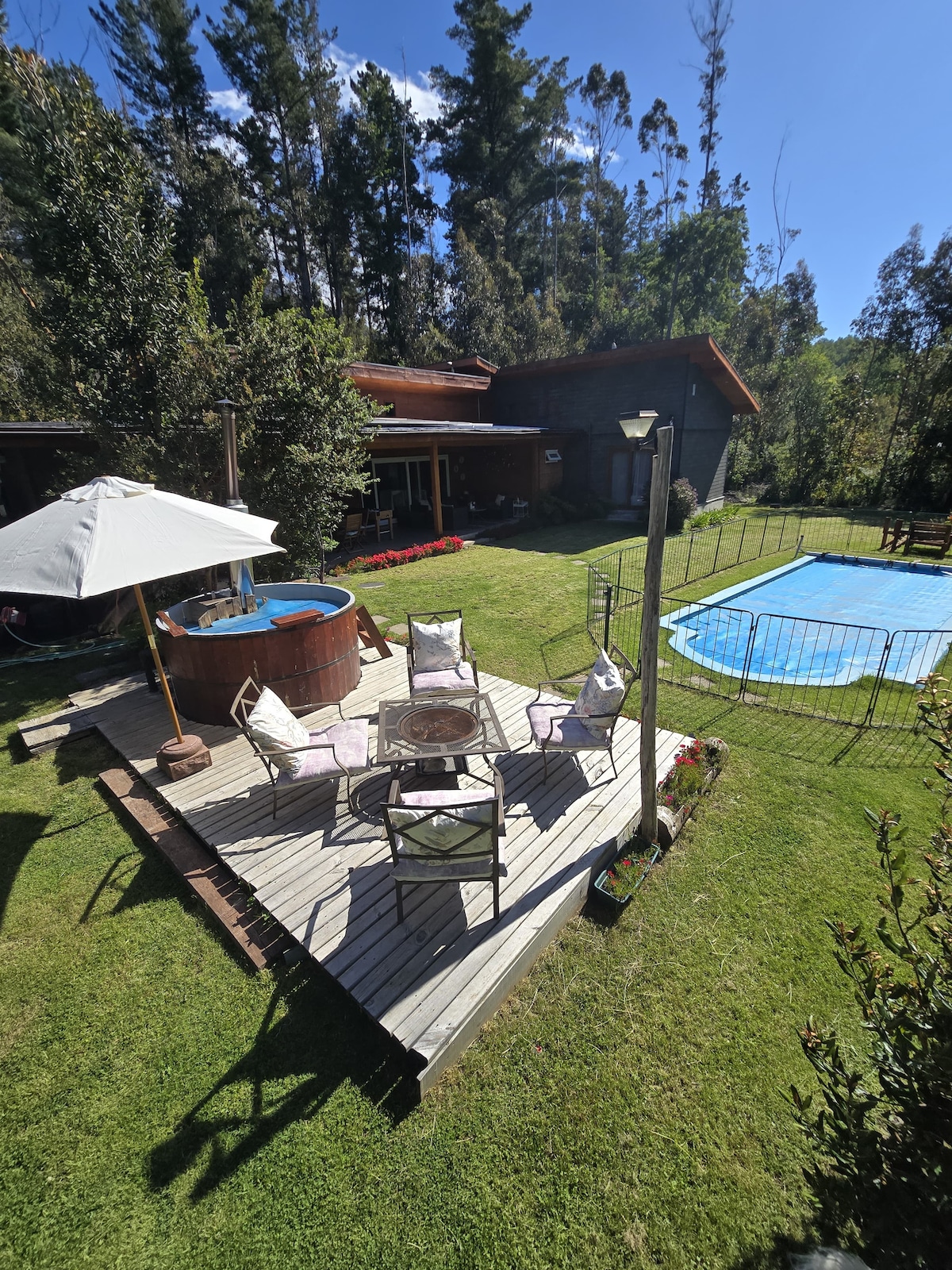 IDEAL PARA 2 a 3 FAMILIAS con cinco dormitorios (tres en Suite). Casa en Condominio con doble control de acceso. Tranquilidad, silencio y privacidad. Casa de Campo en bosque, de un piso con espacios amplios, comodidades y entretenciones. PISCINA TEMPERADA (del 15 de nov al 15 de abril). TINAJA todo el año, dos terrazas amobladas, jardin, Fogón, PARRILLA. Además tiene WIFI de Fibra Óptica, Cocina amplia y full equipada. Tv Satelital en dormitorio y living, Taca Taca, Columpio y Cama Elástic