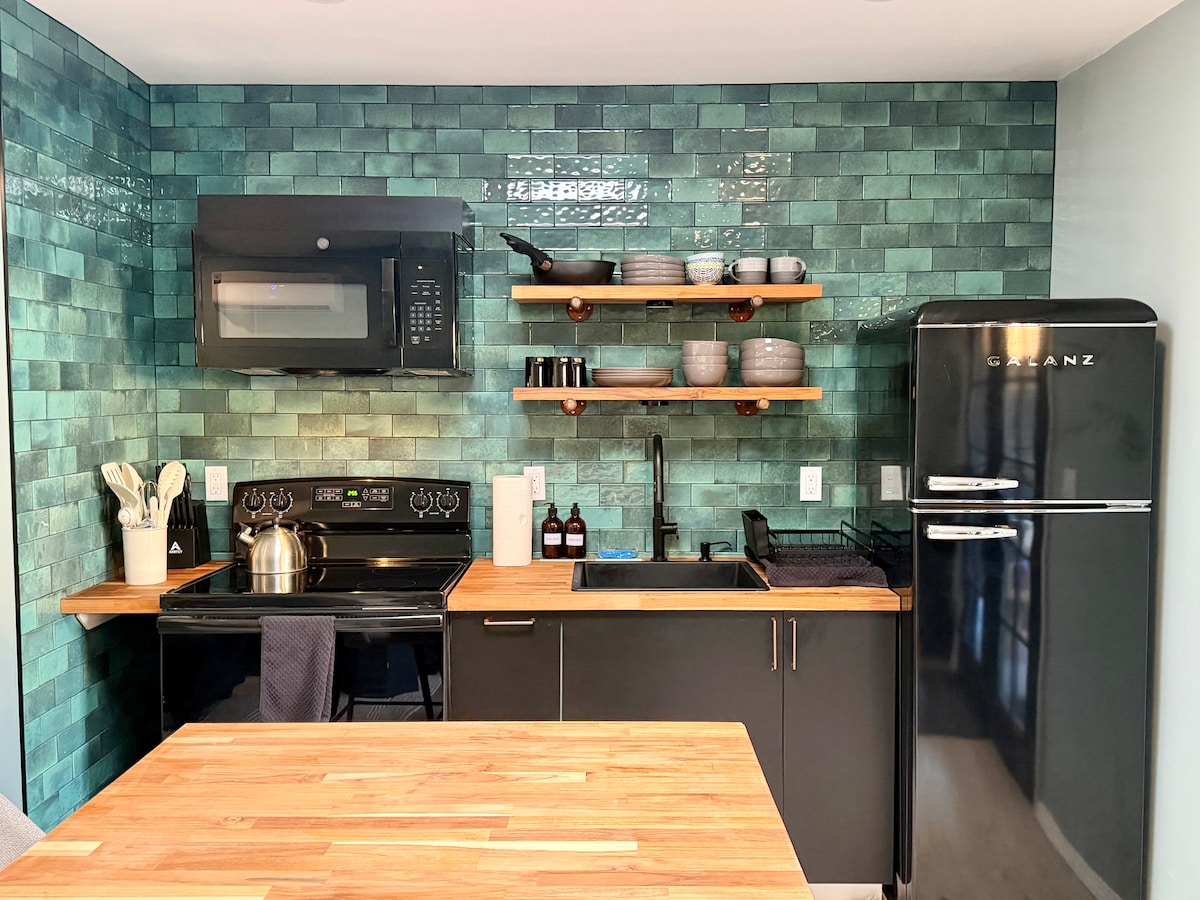 This unique studio has a style all its own, located right near Old Town Plaza/Sawmill District, equipped with so many amenities! This spacious studio has a fully stocked kitchen with custom concrete counters, NM Piñon coffee and assorted teas, dishes, pans, spices and even to-go coffee cups for exploring the city! 50” smart TV, comfy queen bed, beautifully tiled shower with tall shower head, shampoo, conditioner, body wash and linens are all provided so you have everything you need!