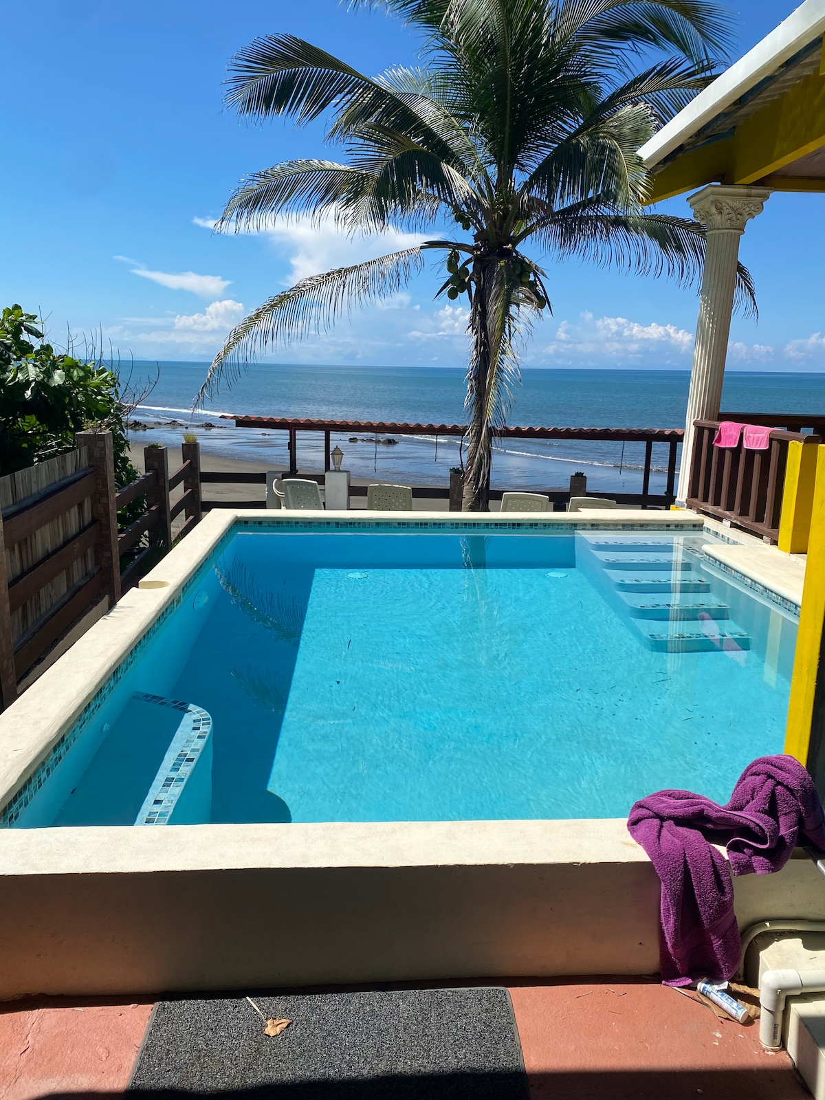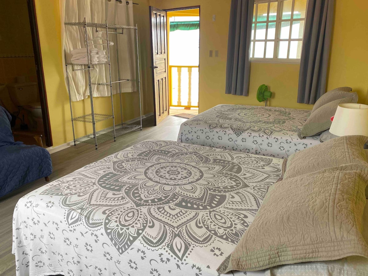 Dieser Familienbereich im 1. Stock ist fantastisch für diejenigen, die mit Kindern anreisen. 2 verbundene Schlafzimmer, ein Zimmer mit einem Queensize-Bett, das andere ein Etagenbett. Mit Pool- und Meerblick von deinem privaten, überdachten Außenbereich, Klimaanlage, heißem/kaltem Wasser, Smart-TV und Minikühlschrank sorgen für einen perfekten Ruhebereich nach langen Tagen in der Sonne! Übernachte bei uns! *Zusätzlicher Gast, der für Kinder bis 12 Jahre verfügbar ist *Eine Steuer in Höhe von 10 % wird separat erhoben, da Airbnb keine Steuern im Namen des Gastgebers erhebt