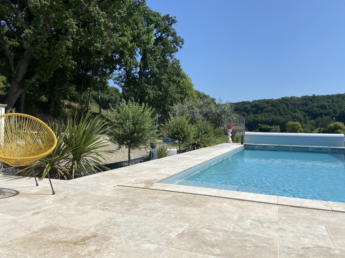 Entfliehen Sie dem Land in dieser geräumigen und heiteren Unterkunft. Herrenhaus aus dem 16. Jahrhundert, eingebettet in einen Wald. Eichhörnchen, Vögel beleben das Holz und kein anderer Lärm, weit weg von den Belästigungen der Stadt. Ideale Unterkunft für eine große Familie und/oder eine Gruppe von Freunden, um sich in der Natur zu erholen. Es ist ein Haus mit Charakter, traditionell in dieser Gegend und geschichtsträchtig. Atemberaubende Aussicht in einem der Täler des Gewächshauslandes, an der Grenze von Quercy und Agenais.