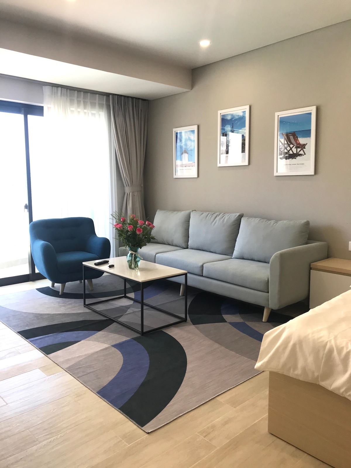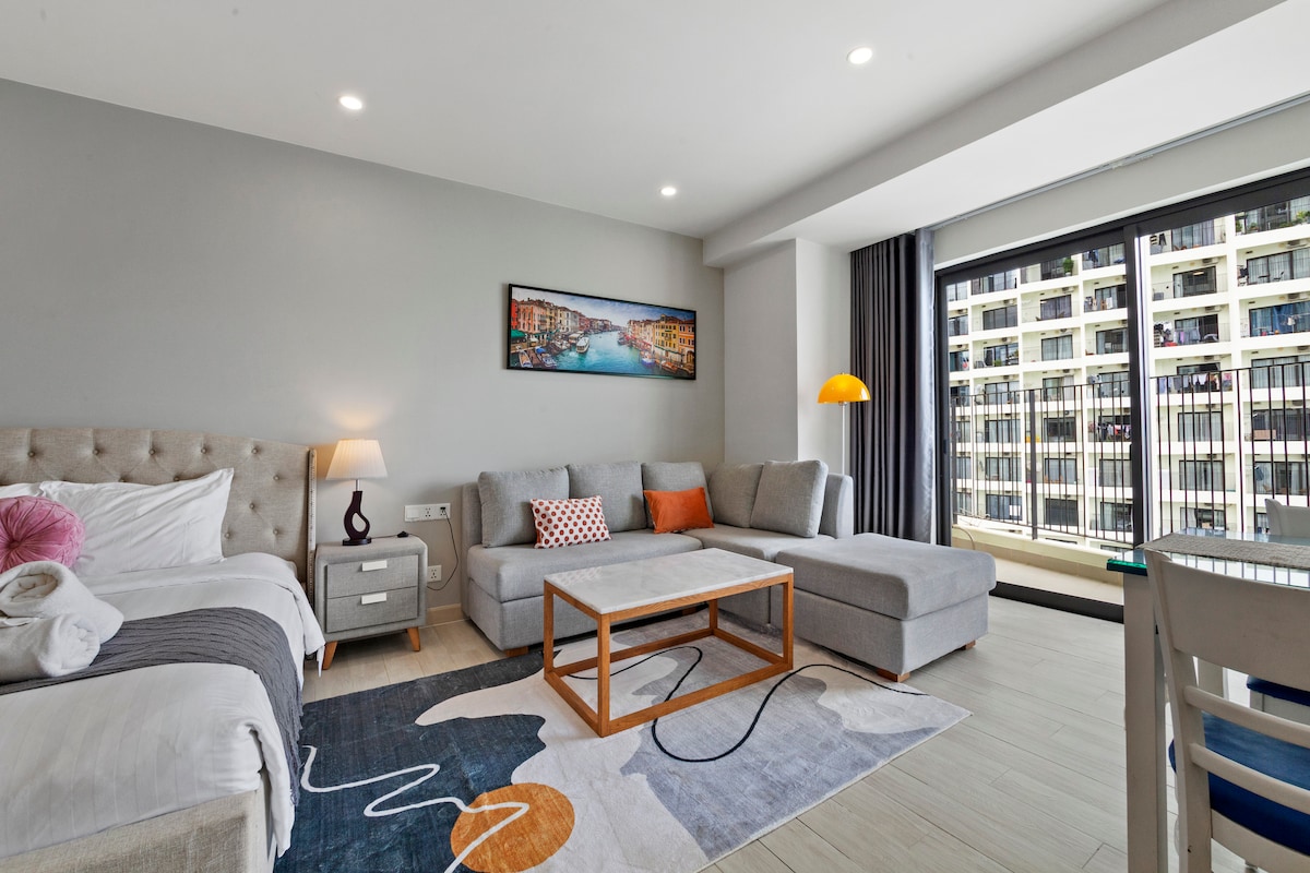Geräumiges Studio-Apartment mit einer Trennwand bietet dir perfekte Privatsphäre. Romantisches Schlafzimmer mit einem weichen, geräumigen Bett. Das komfortable Wohnzimmer verfügt über einen großen Bildschirm-TV mit Highspeed-Internet, eine große Couch, einen entspannenden Sessel... mit einer Waschmaschine, einer modernen Toilette. Die köstlichen Gerichte werden von Ihnen in der voll ausgestatteten Küche mit einem schönen Esstisch zubereitet. Das Schlafzimmer verfügt über einen eigenen Balkon mit einem Platz zum Rauchen und einer sehr schönen Aussicht🌸. 🌸Ein schöner, romantischer Raum mitten in der Stadt am Meer für dich.