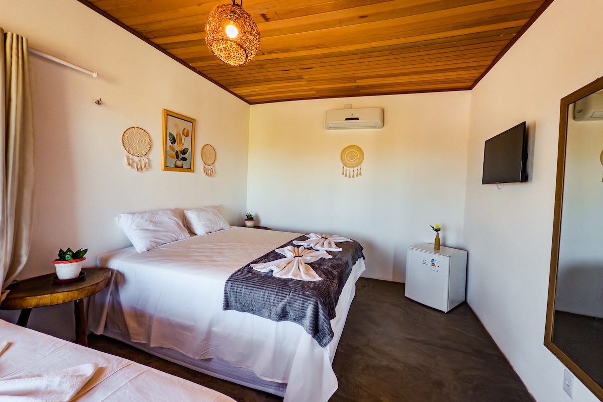 Os quartos foram recentemente aprimorados com ar condicionado, proporcionando um ambiente fresco e agradável para recarregar energias após um dia ao sol. O quarto possui uma cama de casal e uma bicama, além de um suporte para rede.