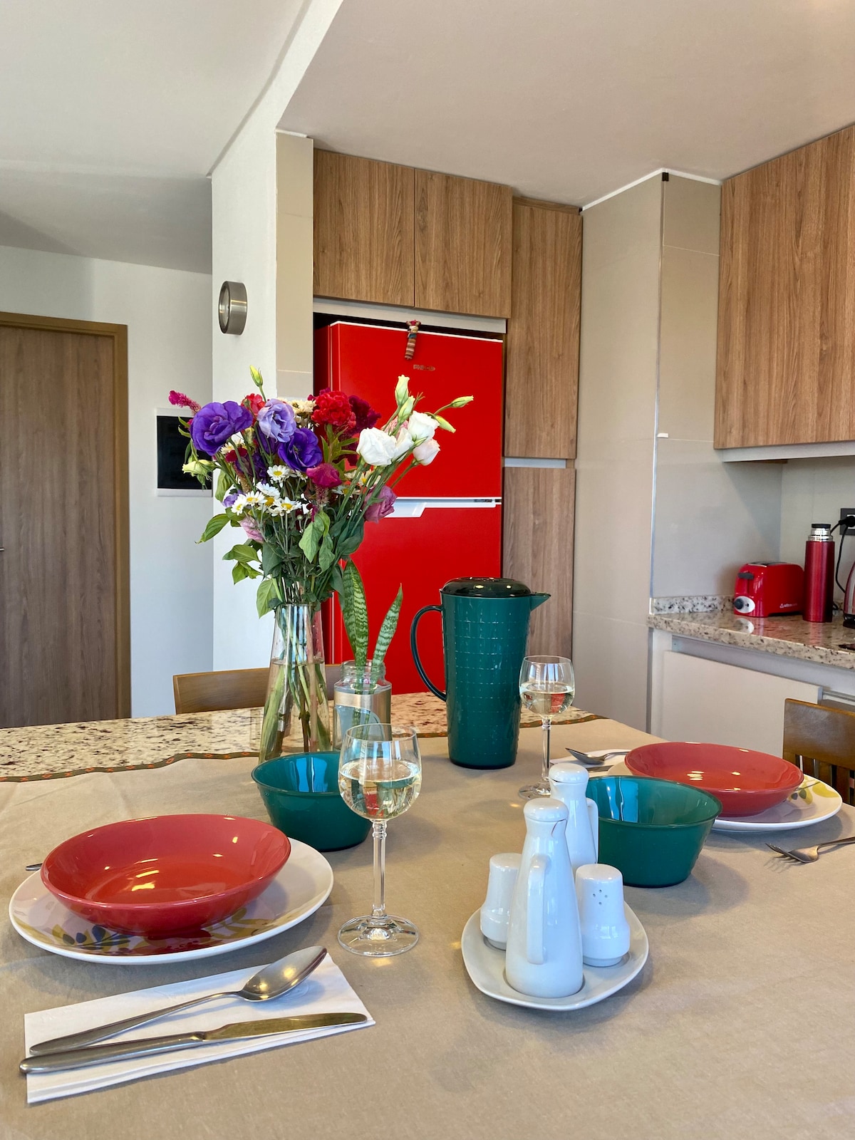 Disfruta de este moderno departamento con gran balcón y vistas que te enamorarán (Sillones y juego de comedor exterior). Dos dormitorios con 2 baños completos. Cocina completamente equipada (lavarropas y lavavajillas). Relájate en un gran sofá para disfrutar de una pelicula. Comedor ideal para compartir momentos. Te recibimos con una canasta de bienvenida de cortesía y ofrecemos gaseosas, champagne y vinos seleccionados (con costo adicional). ¡Perfecto para una estancia inolvidable!