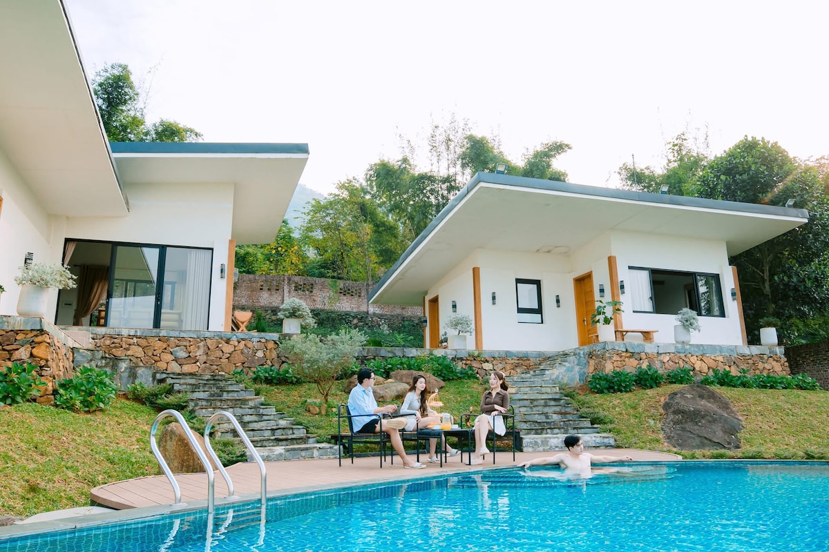 Nép mình giữa thung lũng Cư Yên thơ mộng, Solmist Villa trải rộng trên khuôn viên 4.300m², mở ra không gian nghỉ dưỡng riêng tư, nơi vẻ đẹp mộc mạc hòa quyện cùng tiện nghi hiện đại. Hồ bơi trong xanh giữa thiên nhiên, thảm cỏ rộng rãi và tầm nhìn núi non hùng vĩ tạo nên một bức tranh an yên, lý tưởng cho kỳ nghỉ thư giãn của gia đình, nhóm bạn hay những buổi team building gắn kết.