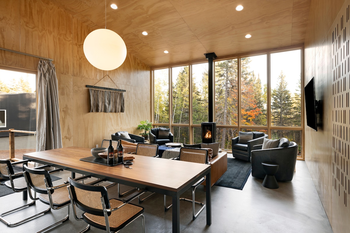 Der ultimative Rückzugsort für Outdoor-Enthusiasten. Das Woodland Chalet ist umgeben von üppigen, borealen Wäldern, Wildtieren und sich schlängelnden Wanderwegen. Eine voll ausgestattete Küche, ein Einzelbadezimmer und Schlafmöglichkeiten für drei Personen. Das Loft-Schlafzimmer im zweiten Stock verfügt sowohl über ein Queensize-Bett als auch über ein ausziehbares Einzelbett, das auf das gewölbte Wohnzimmer und den Gaskamin blickt. Große abgeschirmte Veranda, die sich zum Entspannen und Essen bei Tag und Nacht eignet.