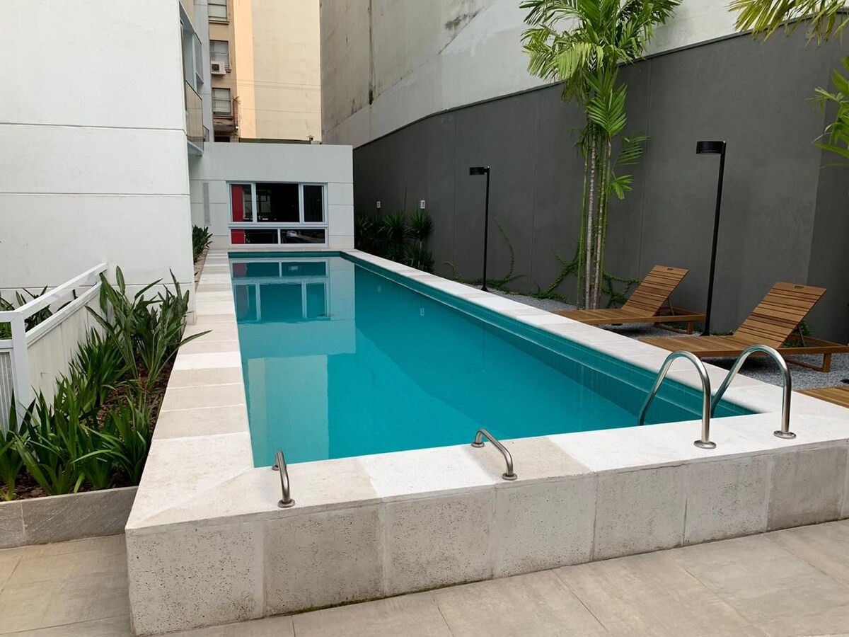 Vista para a piscina, sol da manhã, sem barulho da Av Tiradentes Wifi. EntretenimentoTV de 50 polegadas. Cozinha: Micro-ondas, geladeira, cafeteira, fogão e mais Banheiro: secador, toalhas e roupa de cama higienizados individualmente. Metrô Luz a Passos: Facilitando suas aventuras na cidade. 500 m da 25 de março, 2 km para o Brás, 500 m para a rua das noivas, 400 rua Paula Sousa Proximidade Cultural: 500m da Pinacoteca. 650m Teatro Franco Zampari, 850m Museu da Língua Portuguesa vada coletiva