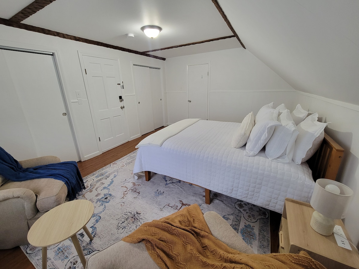 Ground level. Spacious room with a King Bed and a bonus smroom with a ( twin pull out bed) couch and desk/vanity. The sizeable bathroom is freshly remodeled. Kitchenette has a small sink, refrigerator and microwave. It is in a quiet neighborhood only minutes from a rail trail, route 62, interstate 95 route 1 and route 128. Off Street parking. We are 5 miles to Salem Mass, 44 miles to New Hampshire, 77 miles to the cape cod canal, 19 miles to Boston. We are 4 miles to the Beverly train Station.