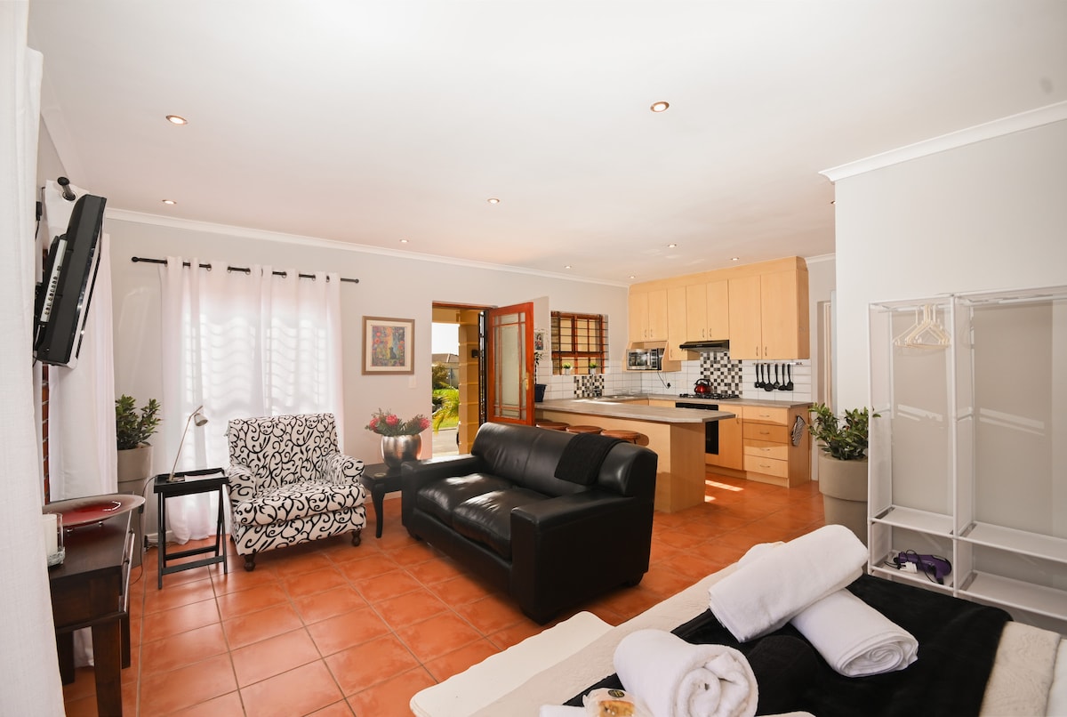 Luxuriöse Gästesuite zur Selbstverpflegung, die an ein modernes Privathaus in einer ruhigen Gegend angeschlossen ist, mit eigenem sicheren Parkplatz und eigenem Eingang. Die Suite verfügt über einen geräumigen, separaten Wohn-/Essbereich mit voll ausgestatteter Küche. Die Unterkunft ist mit Solarstrom/Batterie auf USV ausgestattet, sodass das südafrikanische Phänomen des Lastabwurfs/Stromausfalls wenig bis gar keine Auswirkungen auf unsere Gäste hat. Es gibt auch einen Regenwasserspeicher, der bei Problemen mit der kommunalen Wasserversorgung gefiltert und zum Haus geleitet wird.