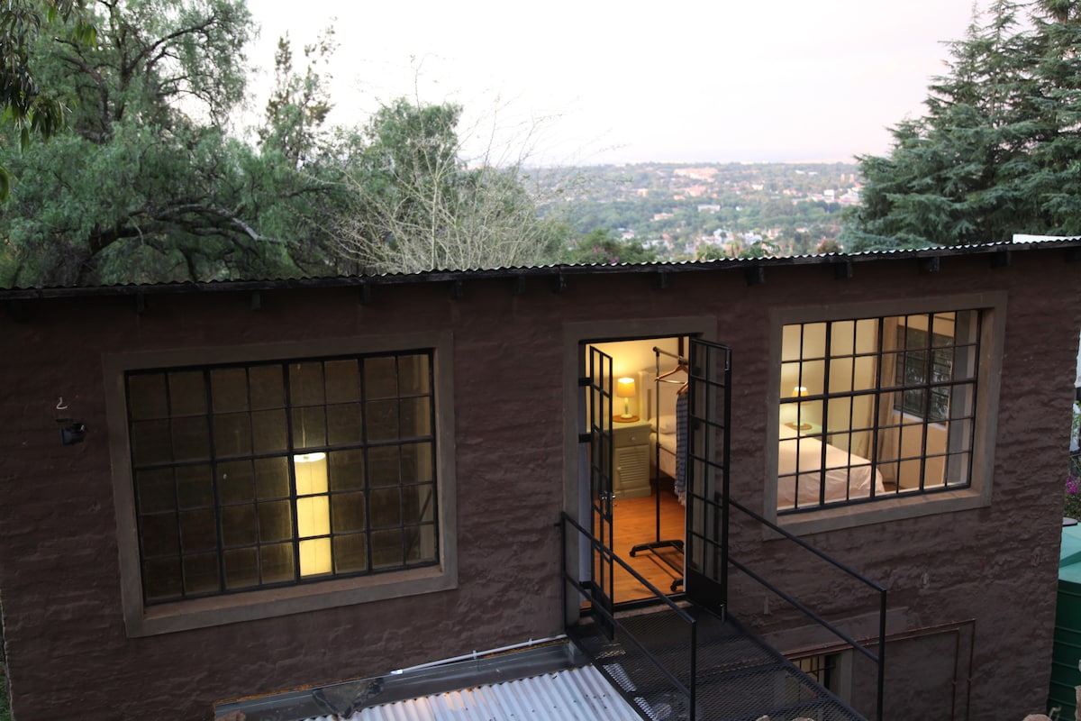 Diese zentral gelegene Selbstverpflegung, freistehende, magische Berghütte strahlt Charme und Abenteuergeist aus. Sie liegt auf dem Bergrücken und blickt auf die nördlichen Vororte von Johannesburg und befindet sich in einem geräumigen Garten voller botanischer Köstlichkeiten, Vögeln und Schmetterlingen. Ruhige, ruhige Gegend, die sich zum Entspannen oder Arbeiten eignet. Wir haben eine Solar- und Batterie-Stromversorgung und einen Wasserbehälter, also Strom- und Wasserreserven.