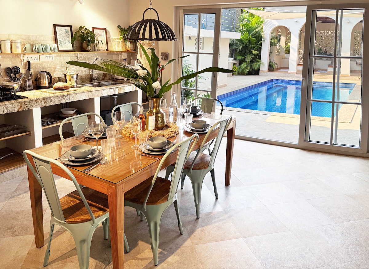 (Bitte beachte - die Wohnung befindet sich im Erdgeschoss und es gibt keinen Aufzug. Parkplätze sind draußen auf der Straße) Versteckt in einem der charmantesten Viertel von Colva, nur einen Steinwurf vom geliebten Menino Jesus Café entfernt, verbindet diese durchdacht gestaltete 2-Zimmer-Wohnung klassischen Goan-Charme mit modernem Komfort. Diese Unterkunft befindet sich im ersten Stock und ist ideal für Familien, Paare oder kleine Gruppen, die das Beste von South Goa erleben möchten.