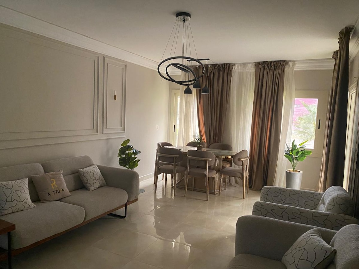 An ENTIRE APARTMENT with a back garden situated in a beautiful and green area in a peacefully integrated community fulfilling all residents' needs. Rooms are newly furnished, air conditioned, smart T.V. and all amenities you might need, super CLEAN and QUIET. The apartment is 25 minutes from Cairo intInternational Airport. coffee shops, restaurants, supermarkets, and pharmacies are all nearby. Hotel standard quality with home like comfort offered with a REASONABLE PRICED.