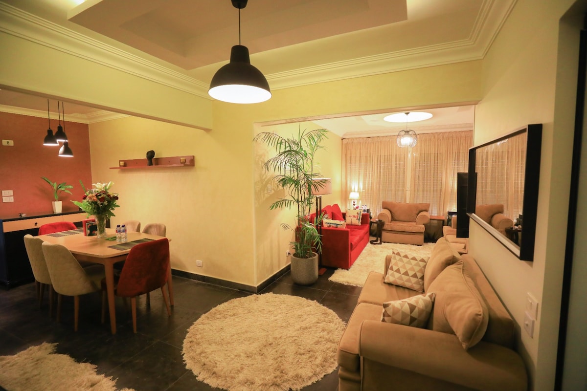Unser Haus befindet sich im lebhaften Mohandessin und bietet: • Sonniges Apartment im 15. Stock • Moderner schneller Aufzug • Geräumiges Schlafzimmer mit Kingsize-Bett und eigenem Bad • Gemütliche zentrale Wohnung • Blick auf den Kairoer Turm & die Pyramiden • Blick auf den Botanischen Garten • moderne Möbel • Smart-Fernseher • Schnelles WLAN • Neue Geräte & Klimaanlage • voll ausgestattete Küche • Waschmaschine • Self-Check-in • Pförtner rund um die Uhr • Unterstützung rund um die Uhr für Gäste • Garagenparkplatz •Auf Anfrage: Privat-Concierge Zimmerreinigung Geführte Rundgänge Keine Gäste erlaubt.